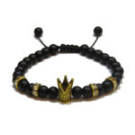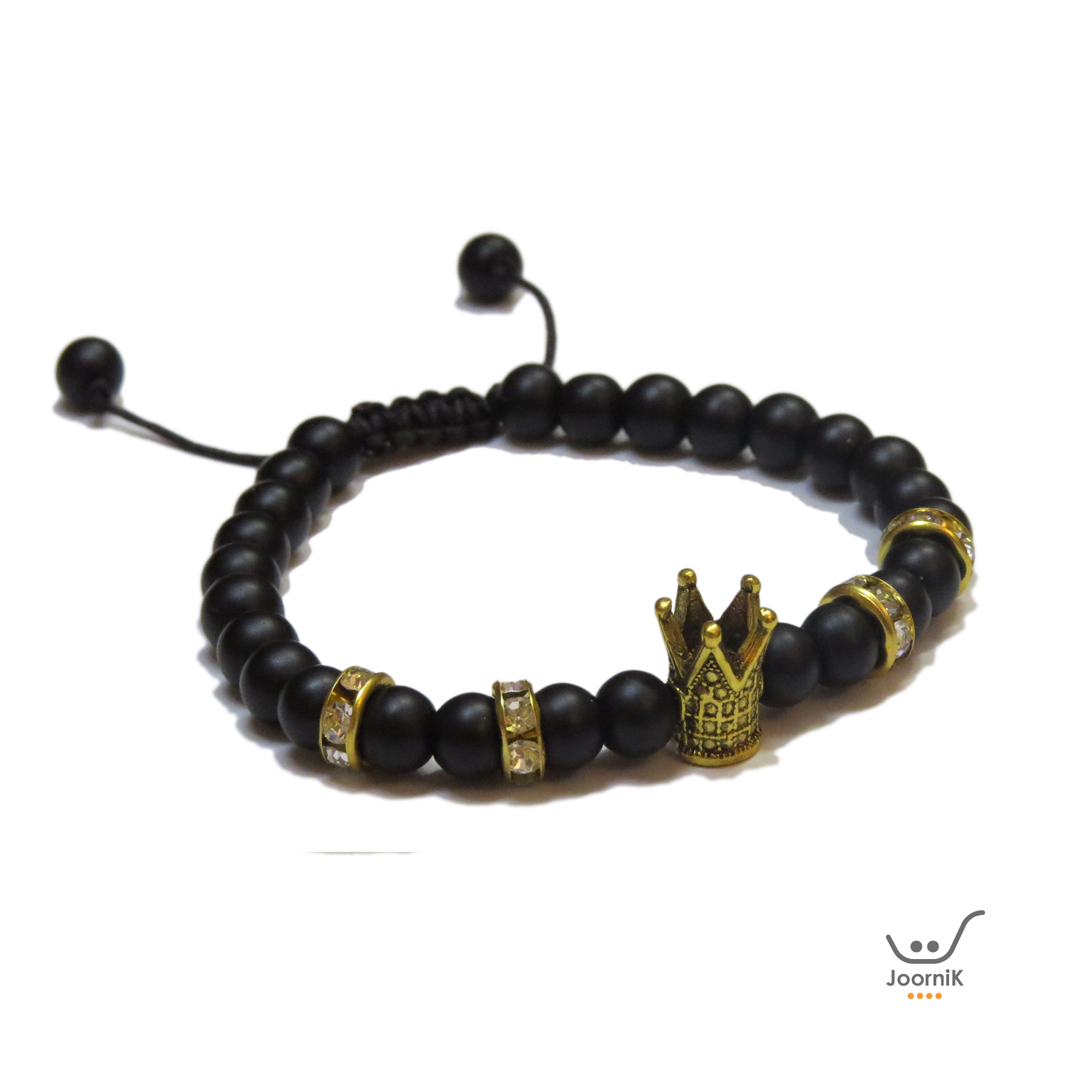 همنشینی سنگ مشکی مات با حلقه های نگین دار طلایی و تاج، استایلی شکیل و زیبا برایتان بهمراه دارد.